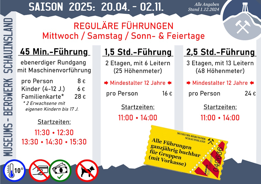 Die längeren 1,5 h- und 2,5 h-Führungen bedürfen jedoch warmer Kleidung und festem, höheren Schuhwerk, vorzugsweise Wanderschuhen. Die Kleidung und das Schuhwerk können verschmutzen! Wir sind eben ein Besucherbergwerk mit sehr authentischem Erleben.